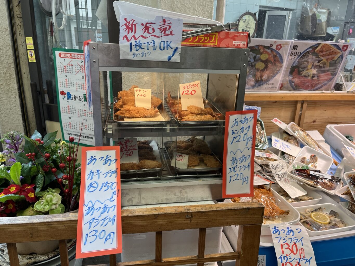 季節ごとにオススメの魚や惣菜がズラリと店頭に並びます。たまにレアな魚が置いてあることも。(こちらは冬に撮影、お正月用の商品が豊富にあります)