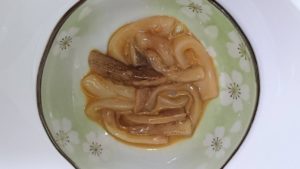 調味料とイカを混ぜ合わせて、鷹の爪を1本いれて和えて完成。少しピリ辛が良い場合は輪切りの鷹の爪を使いましょう。