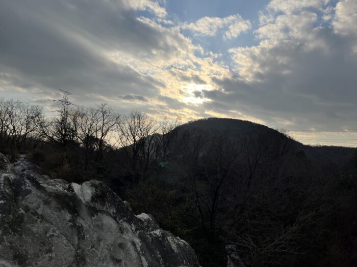 右奥の岩場の上にある鉄塔辺りが屯鶴峯の山頂みたいです。(標高154m)
