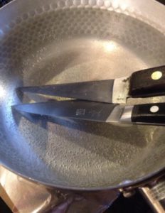 熱湯処理することにより刃先についた脂が浮いて落ちることで切れ味が復活するんです。モチロン殺菌効果もアリ!