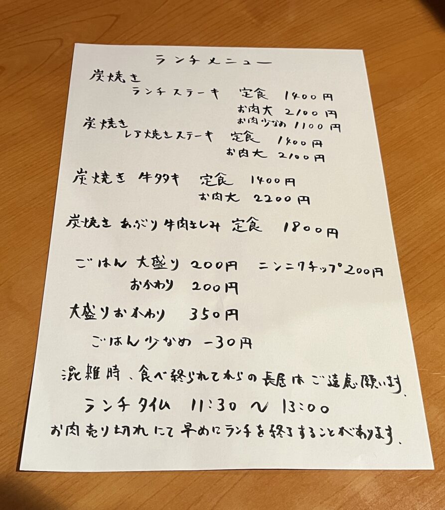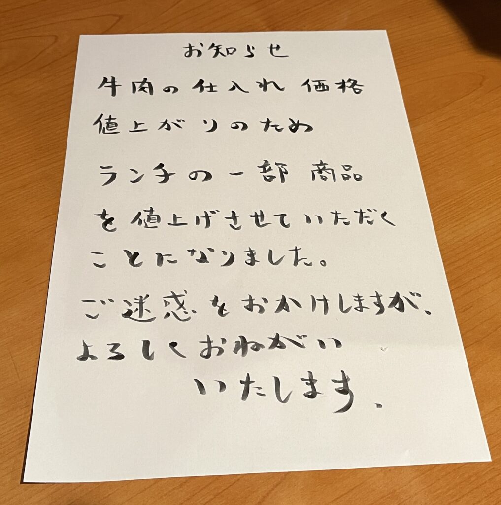 この度、お肉の仕入れ価格が上がりまして、ランチの一部のメニューを値上げさせていただくことになりました。