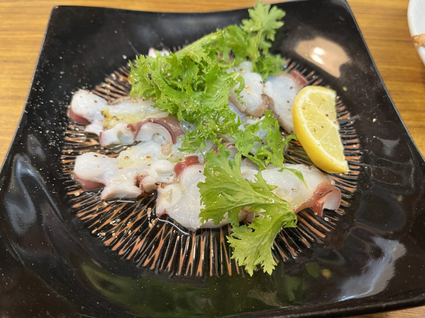常連さん限定メニュー、生タコのカルパッチョ。新鮮生タコのお刺身をカルパッチョにしてもらいました。生タコがあればやってもらえるかも!?