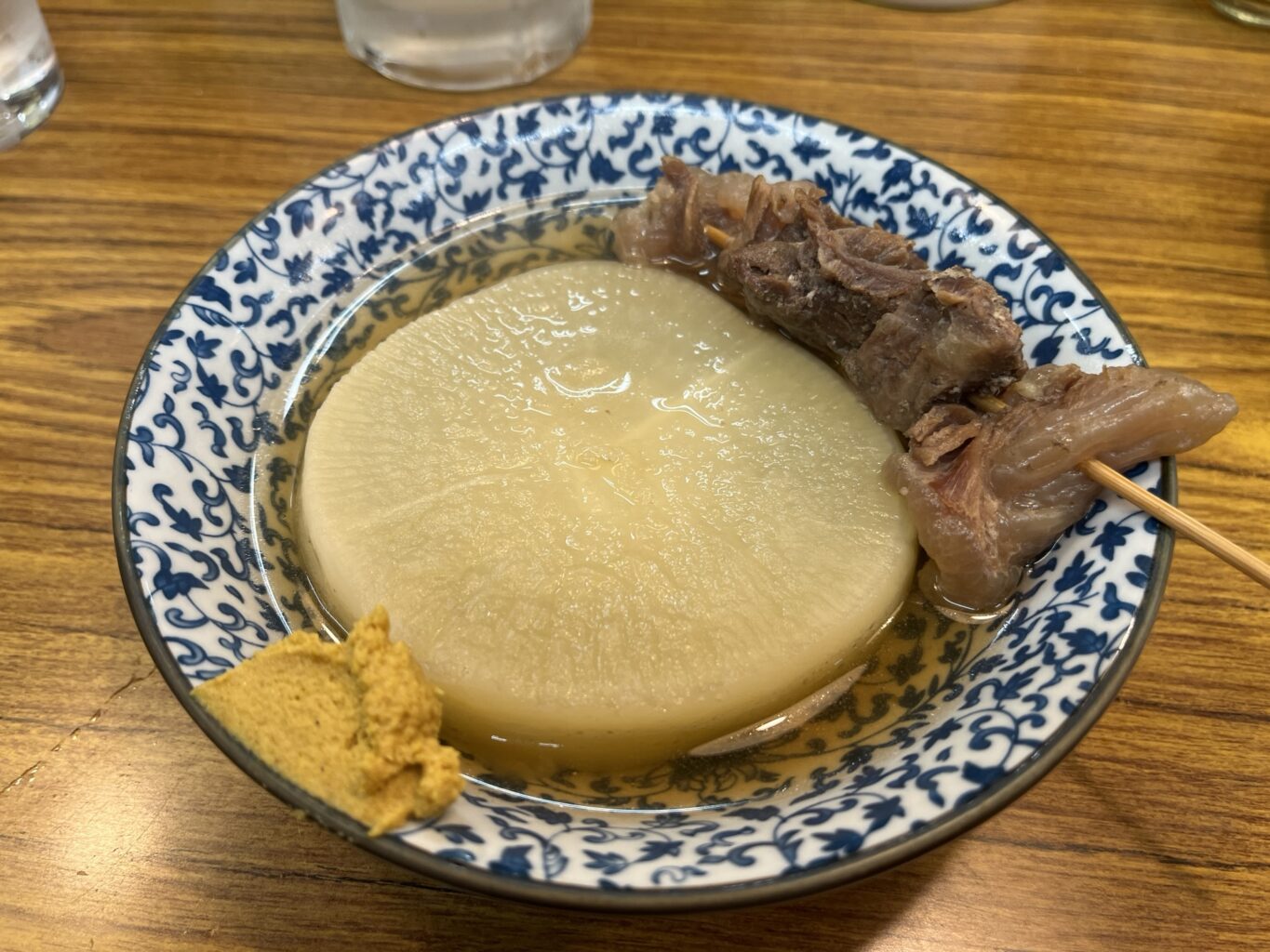 アキレス部分のコリコリ感も楽しめる牛すじ、おでんのスープも良い出汁がでてます。