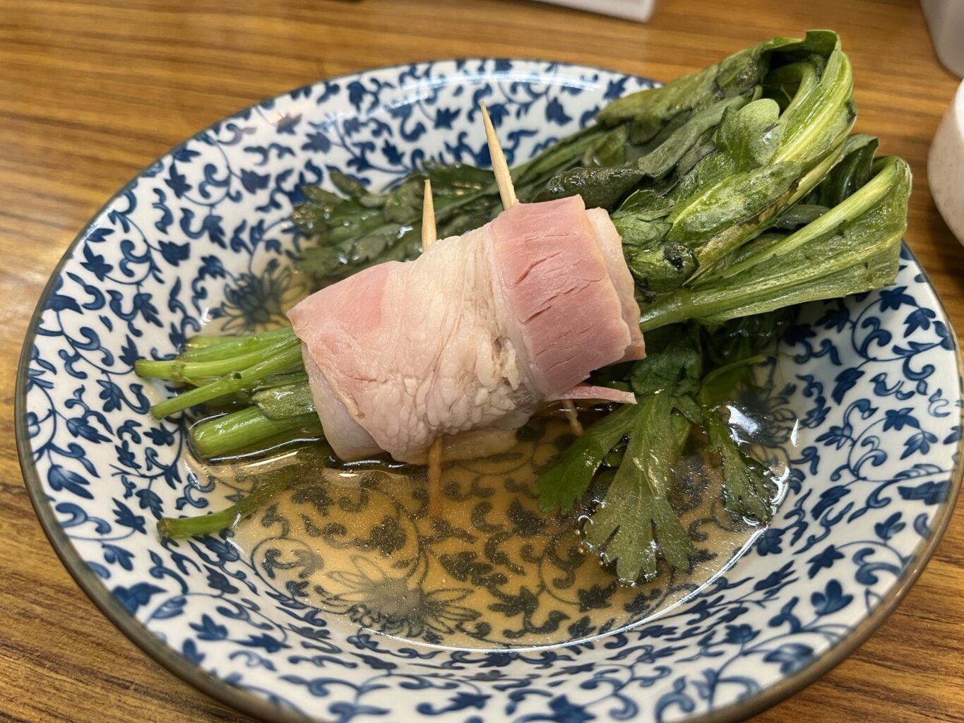 おでんの変わり種 春菊ベーコン 春菊がシャキシャキしててベーコンとよく合います。