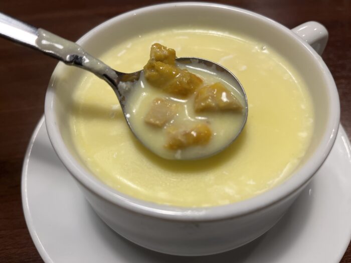 チキンスープ (日本のシチューのようなクリーミーな味わいの中にほのかにスパイシーさを感じました)