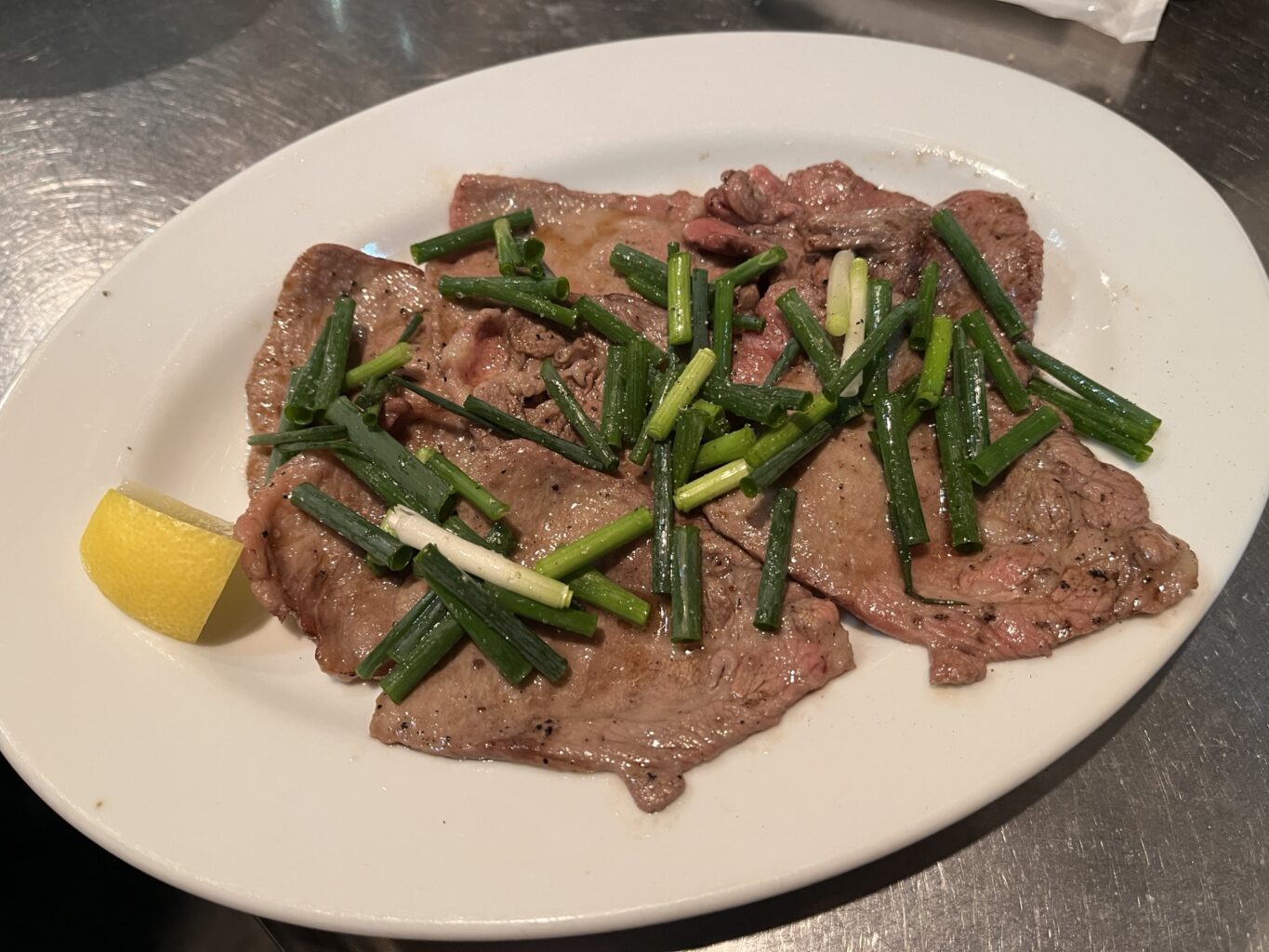 ネギ塩タンは、さっと炙った牛タンに、やっこネギをのせて塩、こしょうで味付けしレモンを絞って食べていただきます。