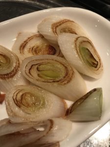 ネギに軽く塩をふりオリーブオイルを鉄板にかけ、コロコロしながら両面を焼きます。